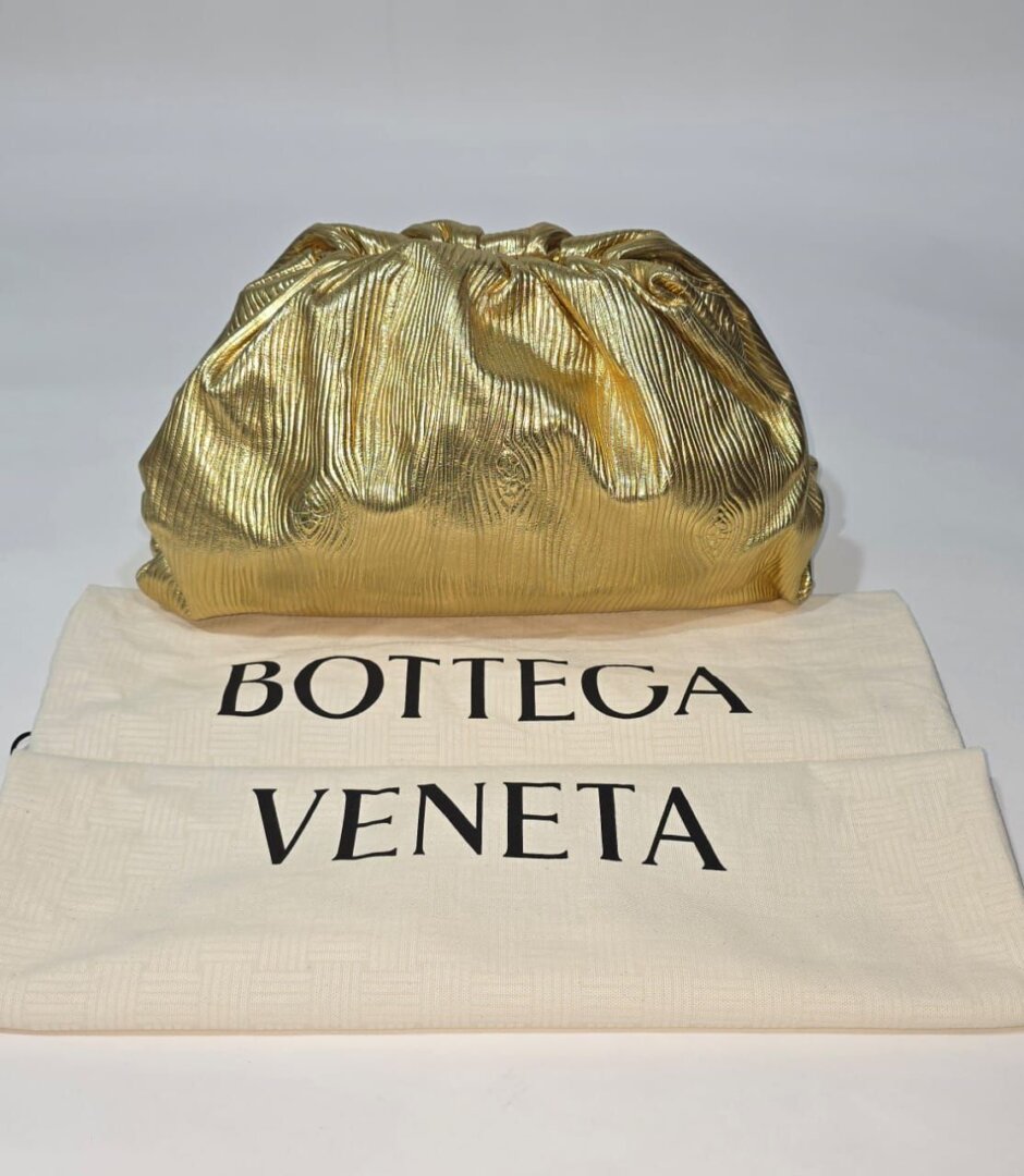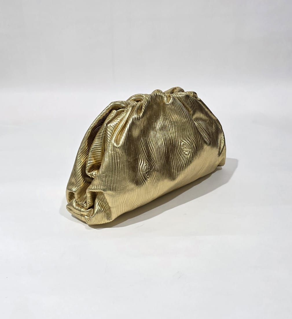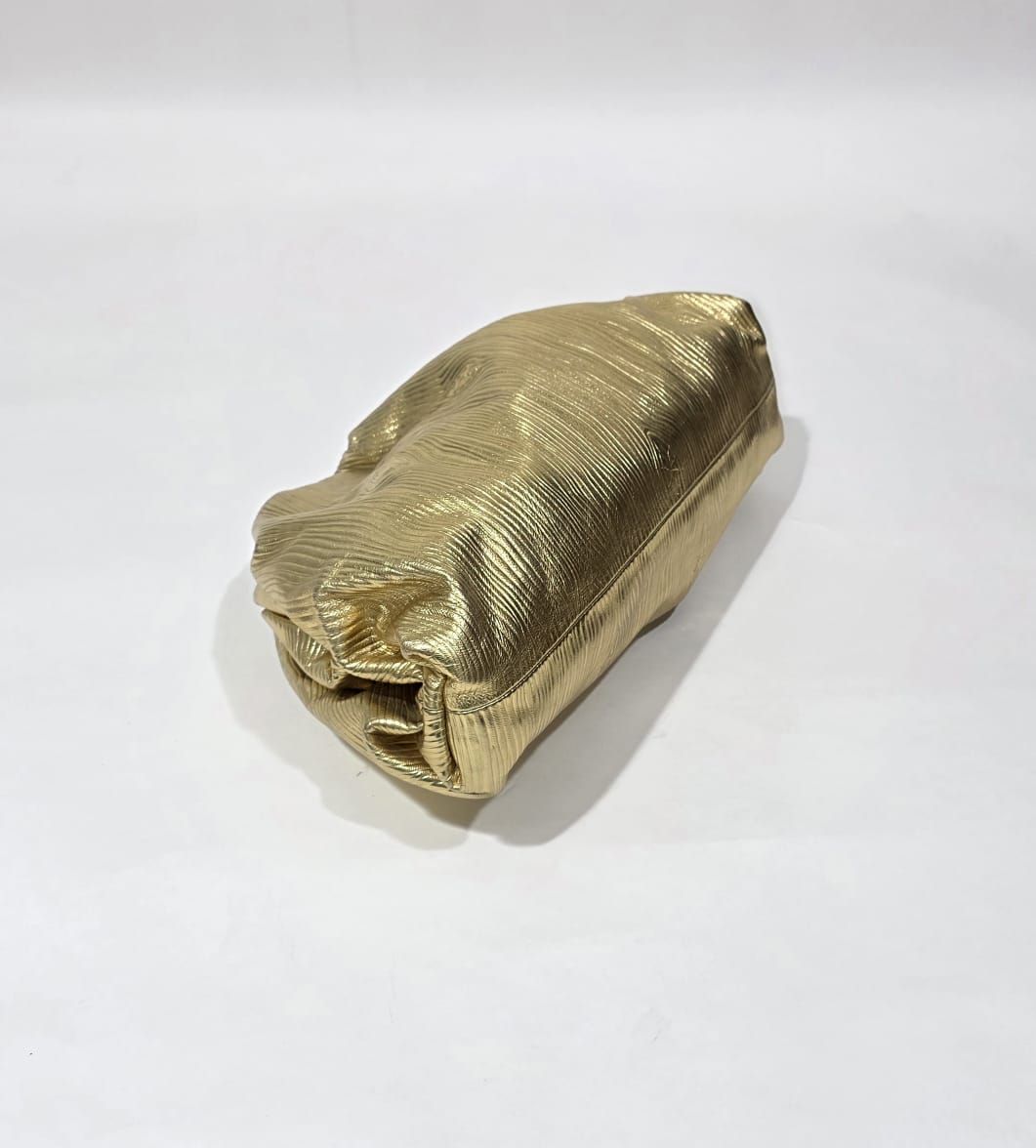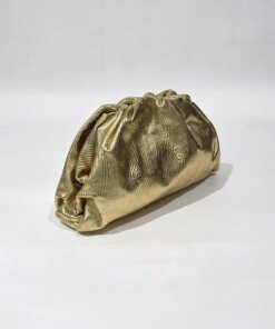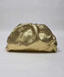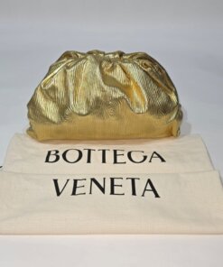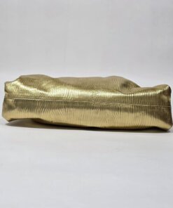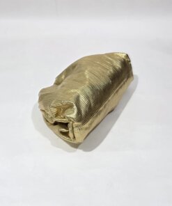 A stunning Bottega Veneta clutch crafted in luminous metallic gold leather, showcasing the brand’s refined craftsmanship and understated luxury. This elegant piece features a sleek silhouette, soft structure, and refined detailing that makes it perfect for evening events or elevated daywear. Lightweight yet eye-catching, it adds the perfect touch of glamour to any outfit.
