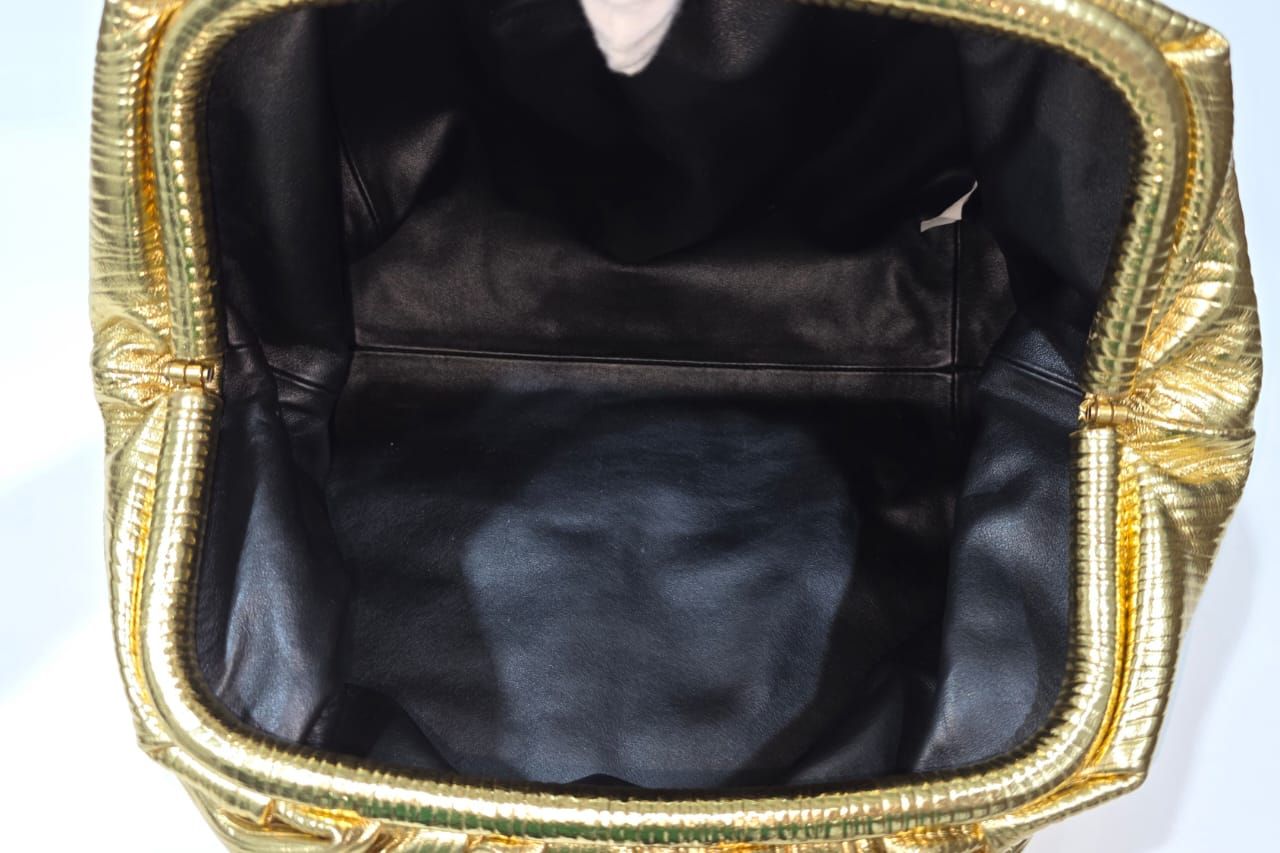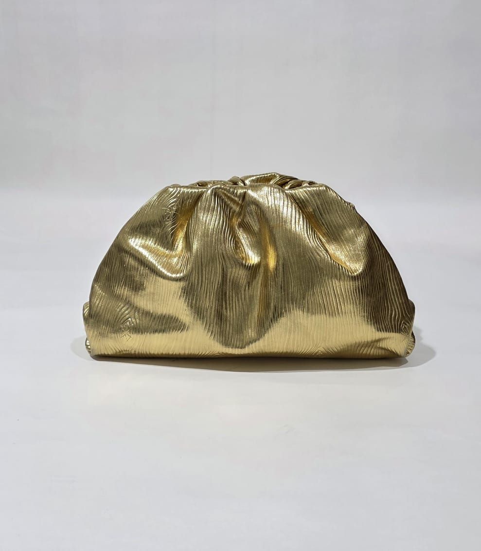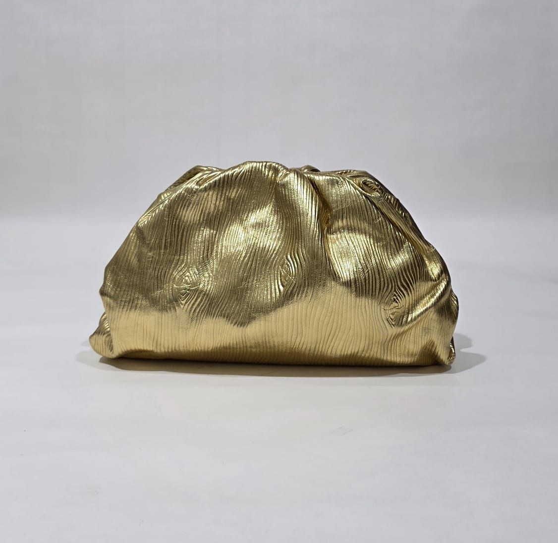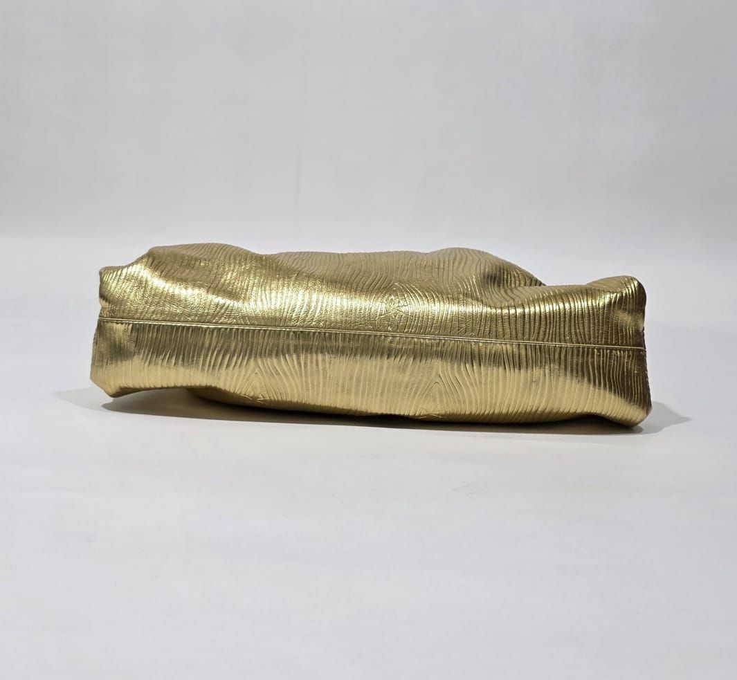 A stunning Bottega Veneta clutch crafted in luminous metallic gold leather, showcasing the brand’s refined craftsmanship and understated luxury. This elegant piece features a sleek silhouette, soft structure, and refined detailing that makes it perfect for evening events or elevated daywear. Lightweight yet eye-catching, it adds the perfect touch of glamour to any outfit.