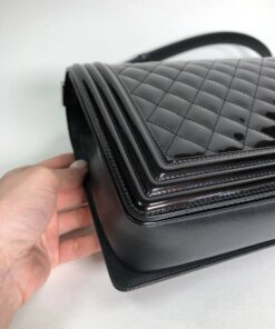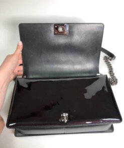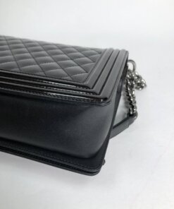 The Chanel Boy New Medium is a contemporary fashion bag for all lovers of Black. This Dark wine, almost black Faux Leather bag with its hard leather strap oozes perfectionism. The Silver-tone metal accents add an elevated level of elegance to this already mesmerizing rectangular messenger bag. Loved by Professionals and Casuals alike, this simple yet intricate Chanel Boy bag will surely hit many similar notes with you.