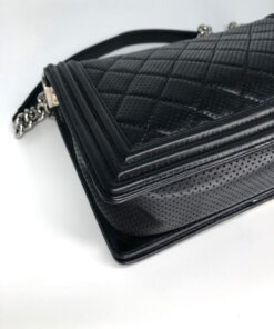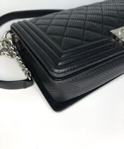 Looking for a timeless and elegant addition to your wardrobe? Look no further than the classic Chanel Boy bag! Crafted from smooth black leather and featuring a sleek silver-tone chain strap, this bag is the epitome of effortless style.