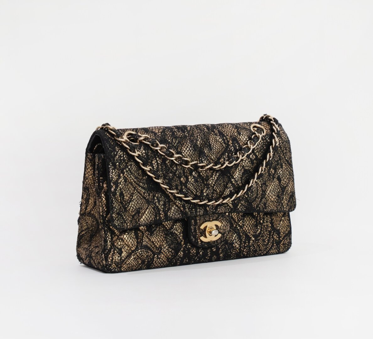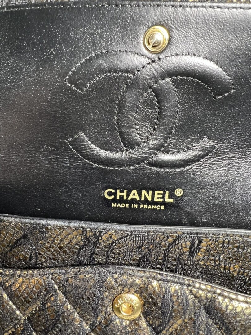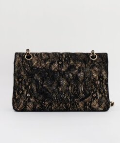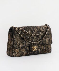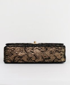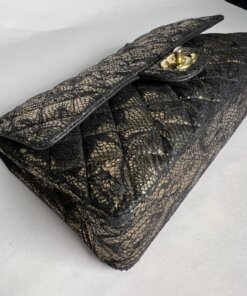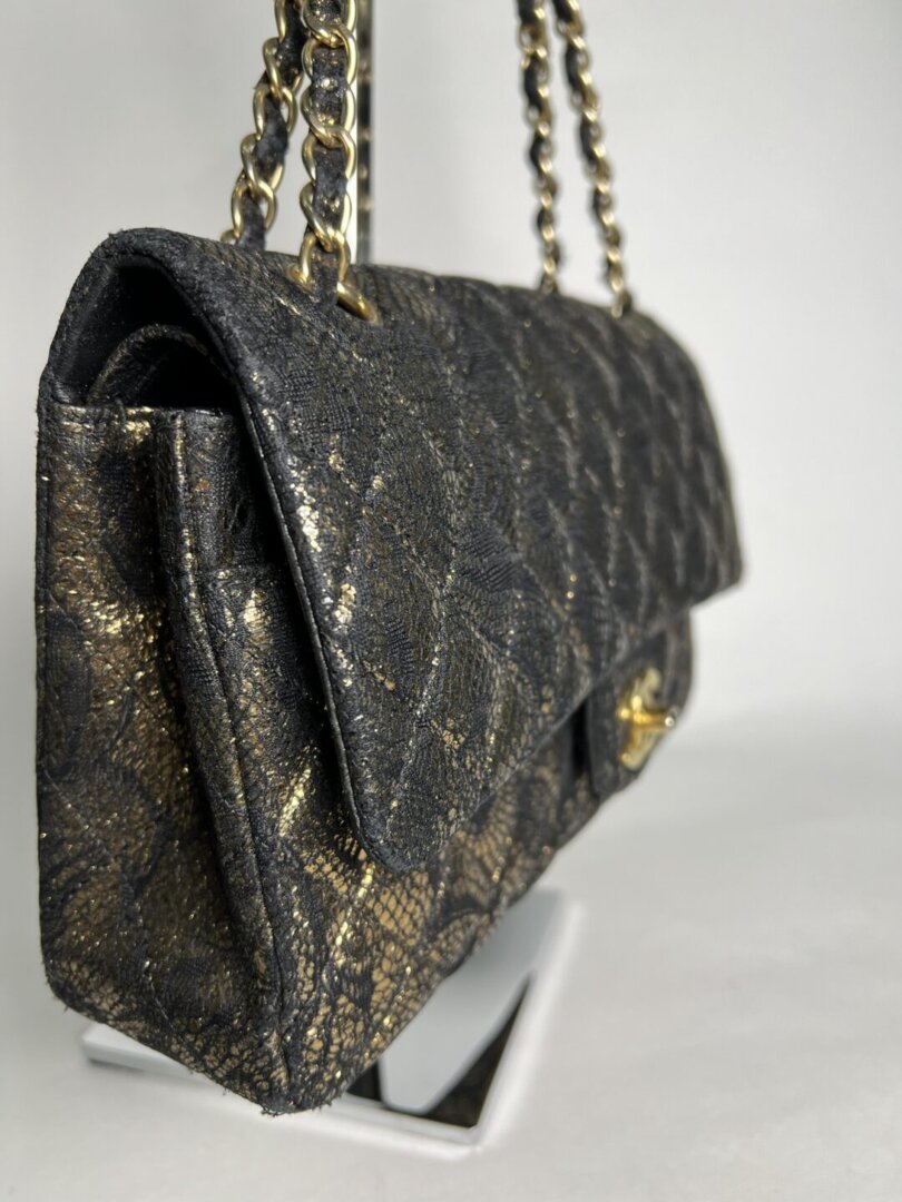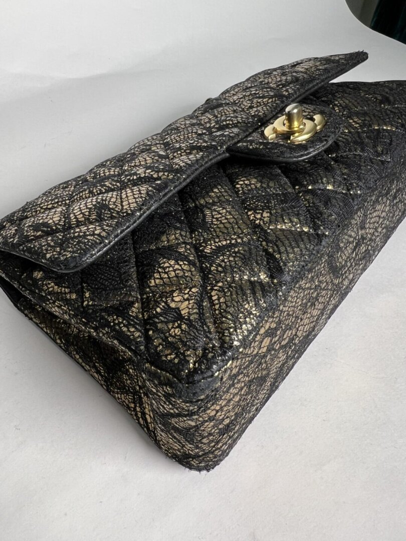 Description : Chanel medium double flap metallic gold diamond quilted goatskin leather with application of black lace on the surfaces