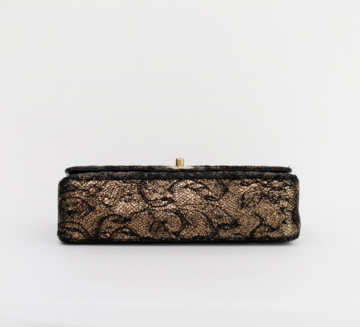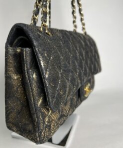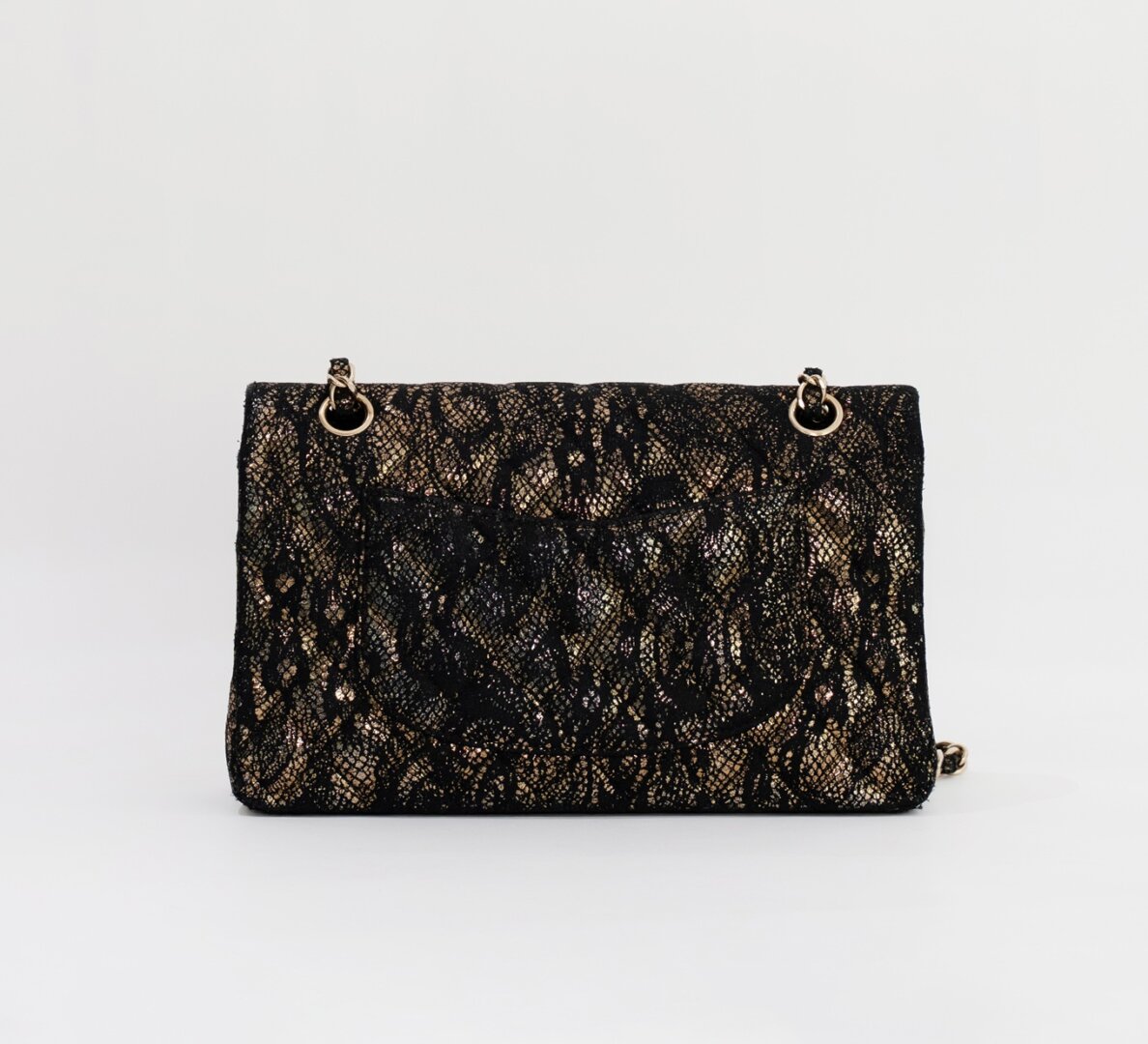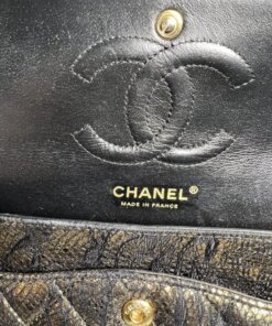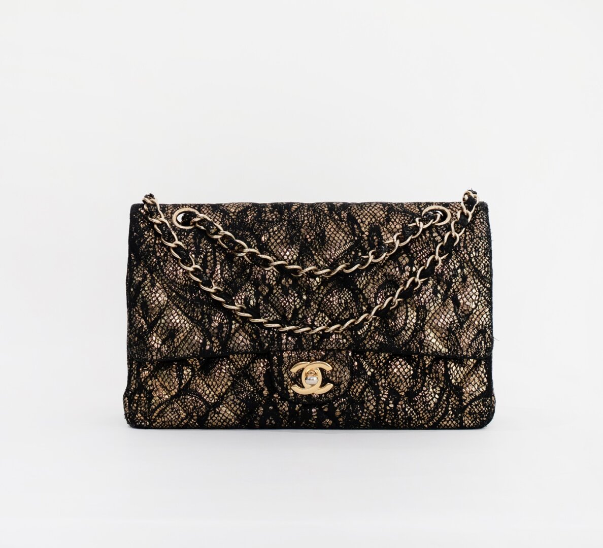Description : Chanel medium double flap metallic gold diamond quilted goatskin leather with application of black lace on the surfaces