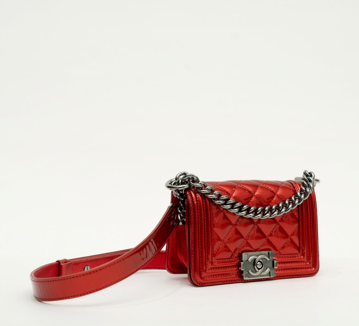 Eye-catching Chanel Mini Boy Bag in glossy Red Quilted Patent Leather. Small size, huge style impact. Perfect for evening essentials.