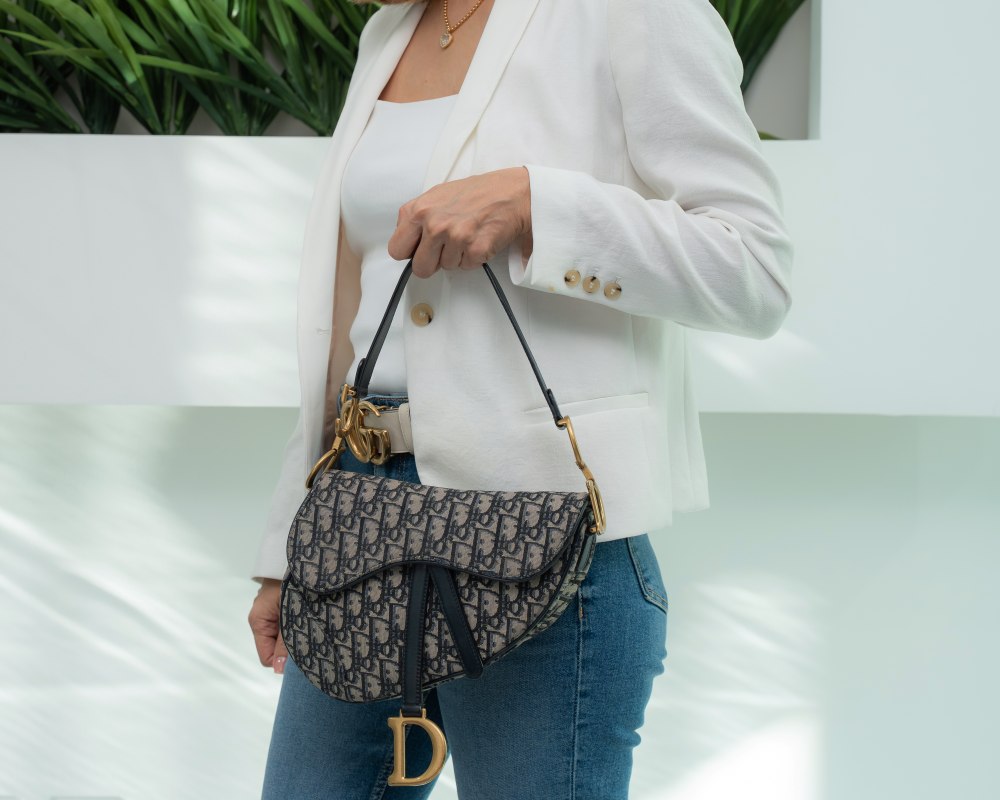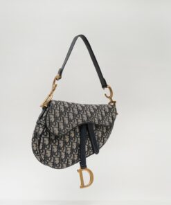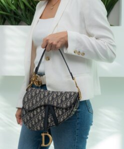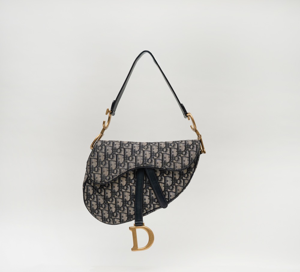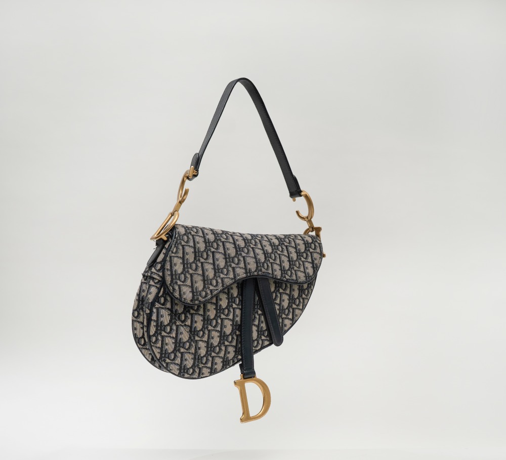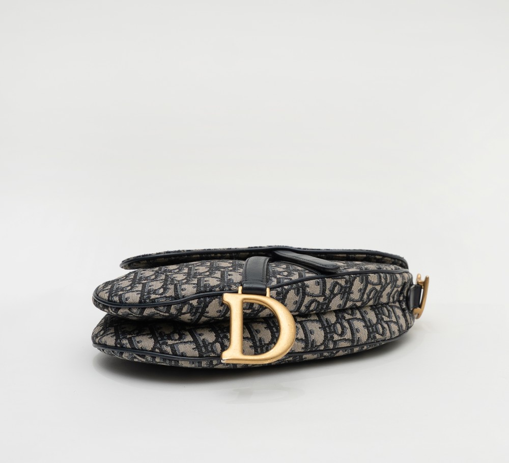 The instantly recognizable Dior Saddle Bag. Features classic Oblique Canvas and sophisticated Navy Leather trim.
