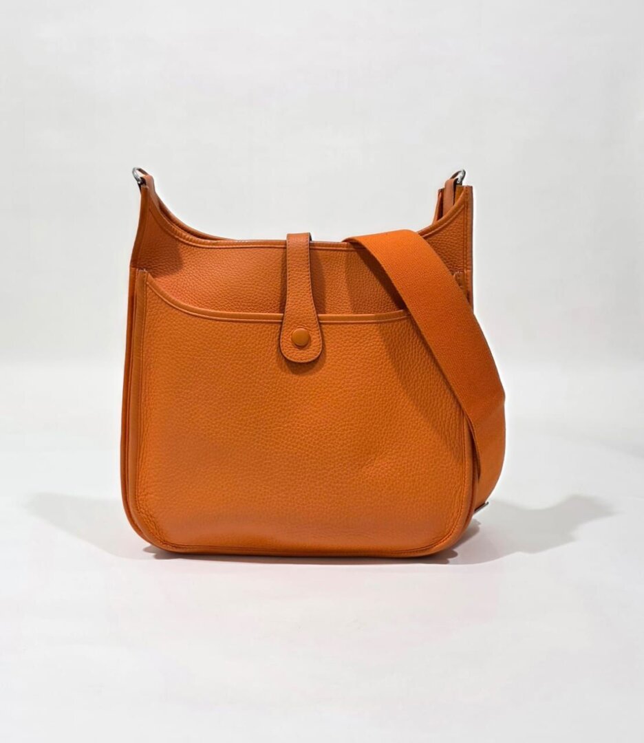 A classic Hermès Evelyne GM crafted from soft, grained Orange Clémence leather — one of the house’s most iconic and vibrant shades. This functional and stylish shoulder bag features the signature perforated “H” logo, a comfortable canvas crossbody/shoulder strap, and the effortless slouch characteristic of Clémence leather. Spacious and durable, it’s the perfect blend of everyday practicality and timeless Hermès craftsmanship.