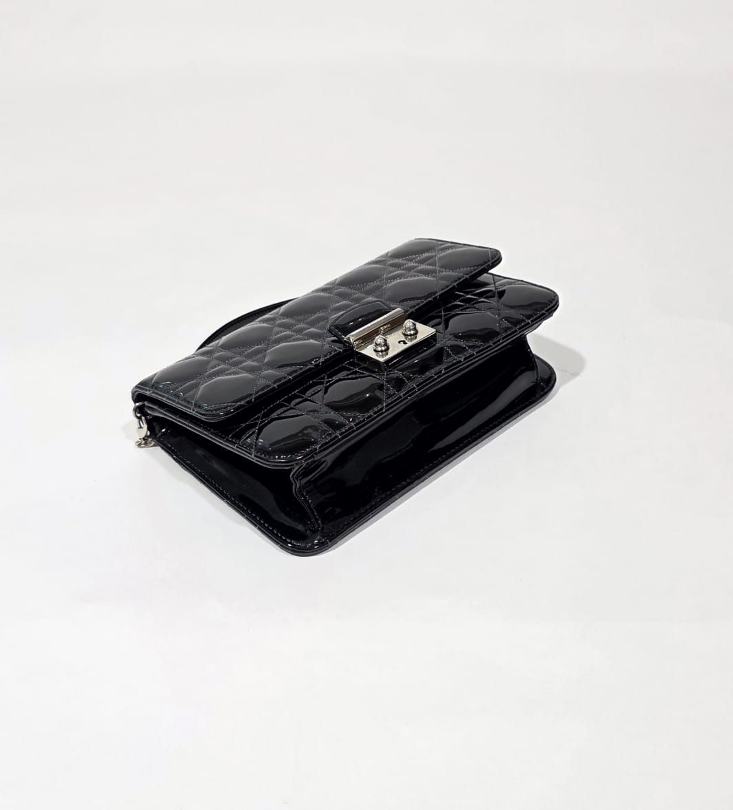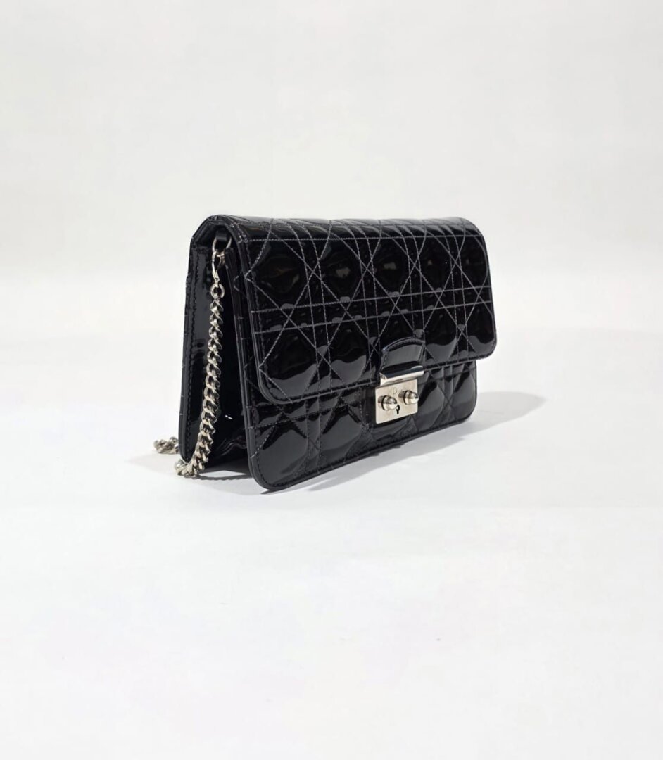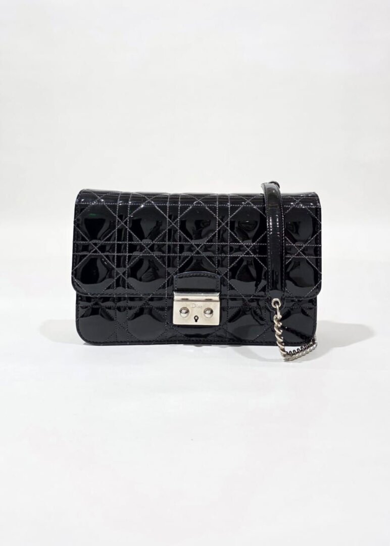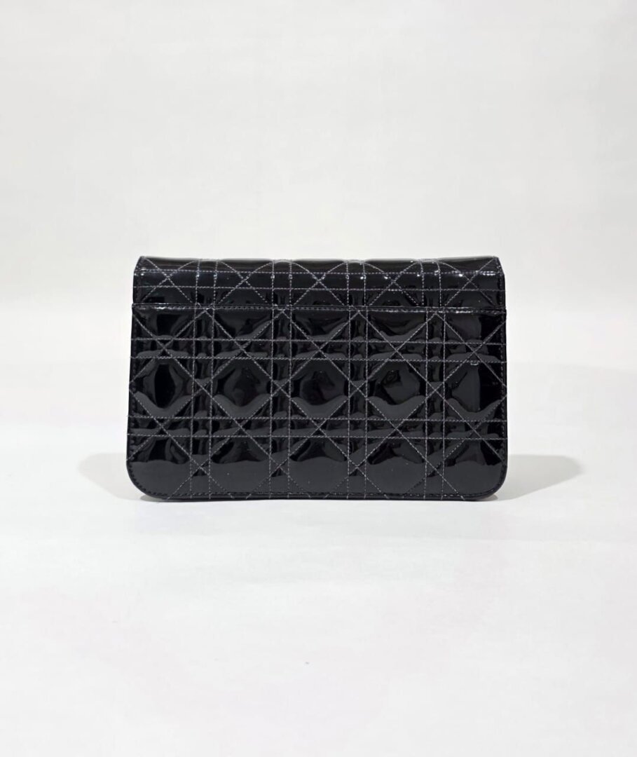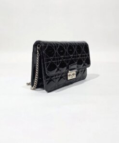 A sophisticated Miss Dior bag crafted from glossy black patent leather and detailed with Dior’s iconic Cannage quilting. This elegant piece features structured lines, refined stitching, and sleek silver-tone hardware that adds a modern, polished finish. Perfectly sized for day-to-night wear, the interior offers organized space for essentials while maintaining a slim, chic silhouette. A timeless Dior classic that brings effortless luxury to any wardrobe.