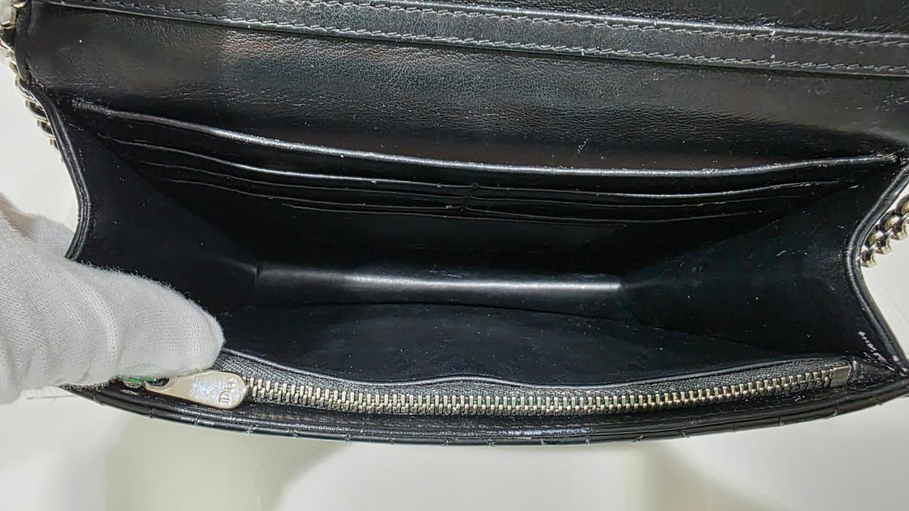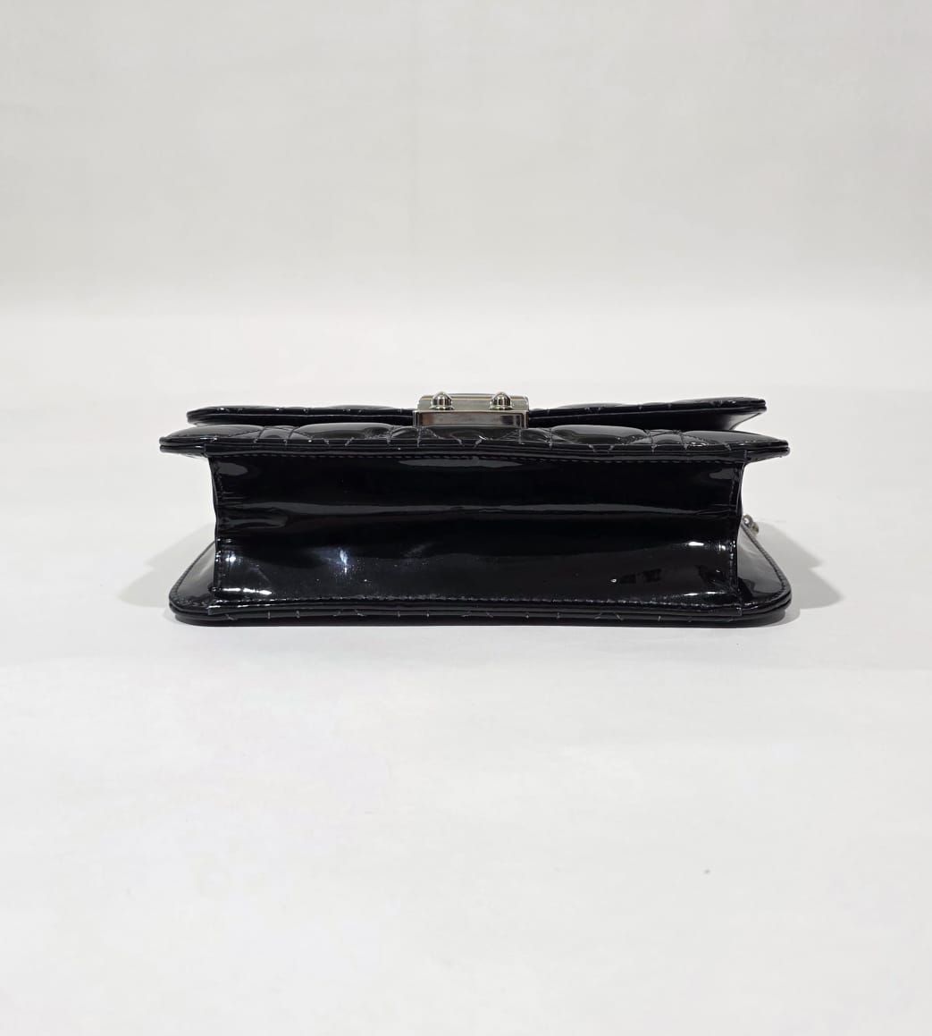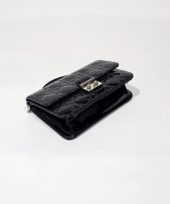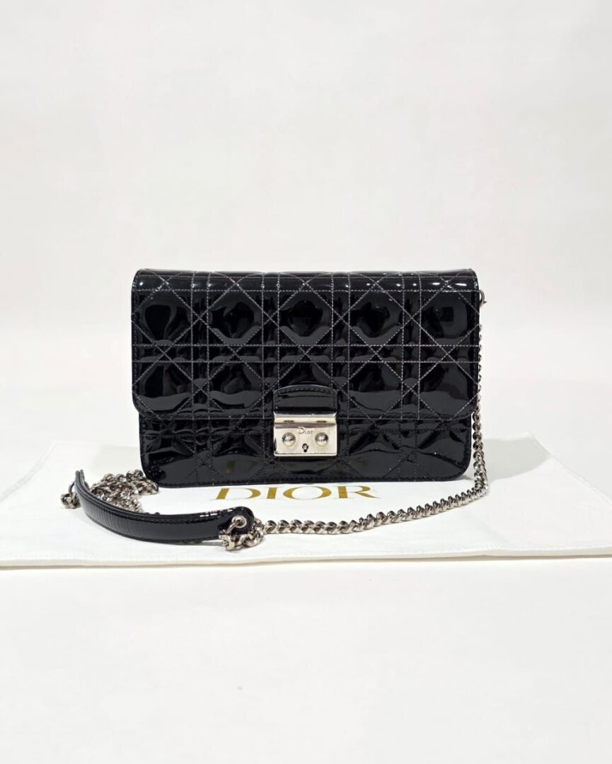 A sophisticated Miss Dior bag crafted from glossy black patent leather and detailed with Dior’s iconic Cannage quilting. This elegant piece features structured lines, refined stitching, and sleek silver-tone hardware that adds a modern, polished finish. Perfectly sized for day-to-night wear, the interior offers organized space for essentials while maintaining a slim, chic silhouette. A timeless Dior classic that brings effortless luxury to any wardrobe.